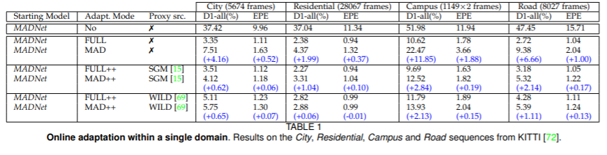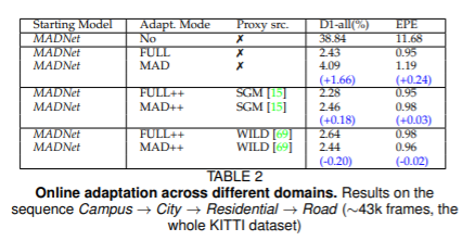 Online adaptation 결과이다. MADNet에 앞서 설명한 FULL과 MAD, MAD++의 결과이다.